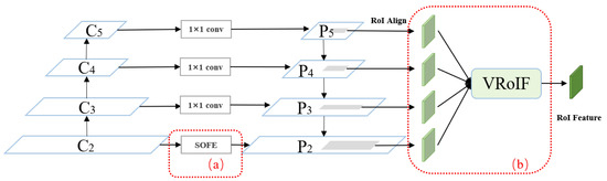 Figure 2 shows the structure of SV-FPN. Small Object Features Enhancement (SOFE) module and Variance-guided RoI Fusion (VRoIF) were conducted in FPN to improve the result of small objects. The SOFE module was added to lateral connections between and , which was designed to enhance , from which small object features are extracted. We propose VRoIF to allow each RoI to use variance as weight initialization to fuse its feature from different feature levels in FPN, and the result of area assignment is weight-added to ensure feature integrity.