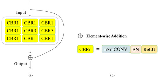 We propose a Small Object Feature Enhancement (SOFE) module, which enhances the small object features based on FPN, and the flowchart of SOFE is shown in Figure 3. As illustrated in Figure 4, a SOFE module consists of 9 CBR modules, which are divided into 3 branches. The CBR module consists of three parts, namely CONV, BN and ReLU, and CBRn represents the size of the convolution kernel as n × n. The convolution kernels in the second CBR module of each branch are designed to different sizes: the 1 × 1 convolution branch is used to obtain inter channel correlation information and retain small object features, the 3 × 3 convolution branch is used to extract features, and the 5 × 5 convolution branch is used to capture the context information around the object so that the context information is helpful for detection. And the pseudocode of SOFE is shown in Algorithm 1. It is worth noting that in order to reduce model complexity and training time, the convolution kernel in the first and third CBR modules of each branch is set to 1 × 1, and the 5 × 5 convolution kernel here is replaced by two 3 × 3 convolution kernels.