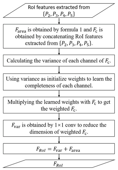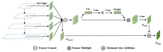 Therefore, this paper proposes VRoIF. Firstly, the variance of RoI features is used to replace the max operation or average pooling of the previous method to obtain the initial weight of the features on {, , , }. At the same time, in order to ensure the integrity of the RoI feature, the result of the area assigned would be weighted and added to the weighted features.