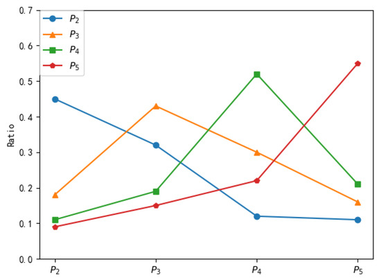In order to analyze the proportion of RoI features of different sizes from different feature layers in FPN, we count the sources of . Figure 7 shows that RoIs with different sizes all exploit features from several different levels with variance-guided fusion. The blue polyline represents small objects that were assigned to originally in FPN, and nearly 48% of the features are from with variance-guided fusion, which explains the integrity of features is useful for detection. The green polyline and red polyline represent large objects that were assigned to and originally in FPN, and it can be clearly seen that their peaks are slightly higher than those of the other two polylines, which indicates that and have stronger semantic information. The peaks of the four polylines all appear in the result of Equation (1), which is consistent with our above analysis.