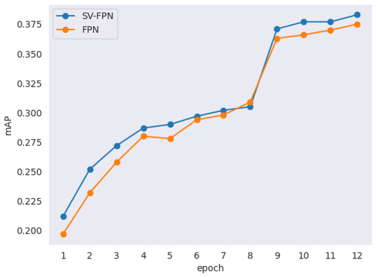 In addition, Figure 8 shows the mAP trend of FPN and SV-FPN during the training process. It was found that the mAP of SV-FPN outperforms FPN at the beginning of training, and the leading advantage is obvious. It is only when the training is relatively stable that the mAP of the two modules is not very different. However, after the decay of the learning rate, the mAP of SV-FPN is still significantly better than that of FPN, and the leading trend gradually stabilizes during the network convergence.