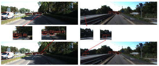 Objects in the KITTI dataset are mostly medium and small objects. It can be seen from Table 5 that after adding the SOFE module, the AP of most categories is increased in the range of 0.3–7.4%, except for the van, and mAR is increased by 3.2%; after adding the VRoIF module, in addition to the slight decrease in the AP of the car, a few objects are the same as the baseline networks, the rest of the categories have been improved to varying degrees, the AP of trams has increased by 8.3% especially, and mAR has been increased from 56% to 58.7%. Last but not least, when adding two modules, that is, when using SV-FPN as the feature extractor, AP and AR were greatly improved—from 38.8% to 41.5%, and from 56% to 60.6%, respectively. The improvement of AP means that the predicted boxes are more accurate, and classification accuracy would be improved; the improvement of mAR means that more objects are detected. Therefore, SV-FPN can ensure the improvement in detection accuracy and reduction in the missed detection rate.