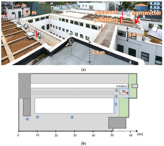 Location 1—terrace of the University of Madeira: (a) image of the location; (b) plan with the transmitter and receiver positions.