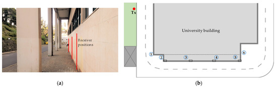 The second location was the environment around the university building, as shown in Figure 2a. This figure also shows some measurement positions. A street surrounds the building, and a wall is on the opposite side. Figure 2b represents the site plan with the receiver positions used for the measurements. For position 1, we oriented the receiver toward the transmitter. In this case, the transmission occurred in the line-of-sight. In the other cases, the building blocked the direct signal, and the received power was mainly due to reflections and diffraction of the transmitted signal. The distance between the transmitter and the last receiver position was 95 m.