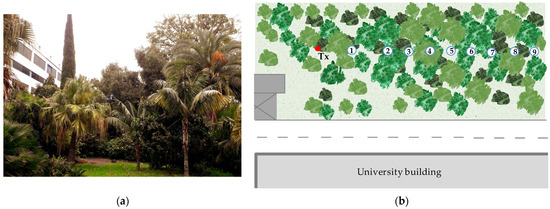 The third location was a zone with dense vegetation on the university campus, as shown in Figure 3a. Figure 3b represents the site plan. We performed measurements between 20 m and 110 m from the transmitter. The Wi-Fi network also affected the transmissions. For some measurement positions, the building was visible from the receiver.