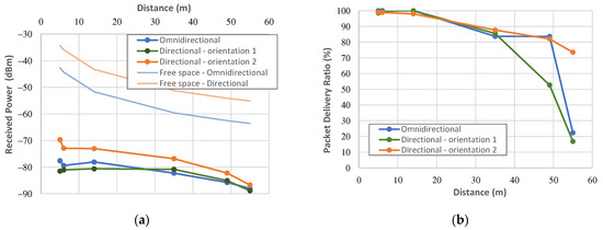 Figure 5 shows the average RSSI as a function of the distance to the transmitter for the three studied situations. The labels inserted in the graph relate the distance with the receiver position shown in Figure 1b. The expected values of received power under free-space conditions are also represented in Figure 5a to determine the attenuation introduced by the medium. This attenuation was almost constant except for distances close to the transmitter. The high attenuation was due to the structure of the building. The directional antenna—orientation 2—provided the highest average RSSI values, with an average of 5 dB above the omnidirectional one. However, the expected received power under free-space conditions would be 7.5 dB higher. Despite the XBee sensitivity being −100 dBm, the lowest measured RSSI was −90 dBm because of the Wi-Fi interference. Figure 5b shows the PDR for the three situations. All antennas have similar results for the first four receiver positions. However, the directional antenna—orientation 2—lost some packets in the first positions because the antenna pointed directly to the Wi-Fi source. Above the fourth position, the directional antenna—orientation 1—had the lowest performance. The systems were not able to receive packets above the last point.