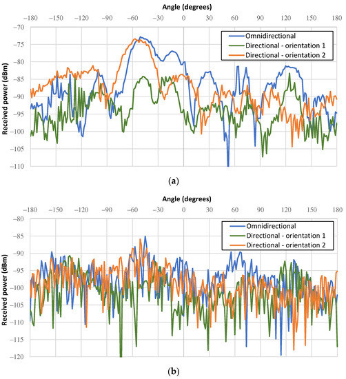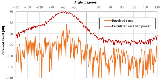 The received signal also allowed the received power for each antenna to be estimated. For this, Equation (1) was employed with g(θ) as the radiation diagram of the respective antenna. Figure 7 shows the result for the directional antenna—orientation 2—in position 2. The estimated power level in the maximum direction was −80 dBm. Applying the procedure to the omnidirectional antenna gave an estimated power of 5 dB below the value of the directional antenna. Applying it to the case of the directional antenna—orientation 1—the estimated power was 10 dB below.