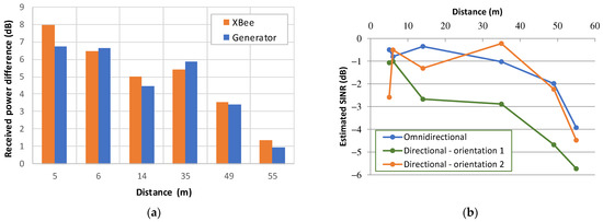 The RSSI values are those represented in Figure 5a, and is the received power from the generator. As we can observe, was always below the RSSI because it corresponded to a received power of a narrowband signal. On the other hand, RSSI corresponded to the received signal plus noise and interference measured in the ZigBee bandwidth of about 2 MHz. Figure 8a shows the difference between the average power received by the directional antenna and the omnidirectional antenna. As can be seen, the results obtained by the generator followed those obtained by the XBee. Despite the higher gain of the directional antenna, the received power difference decreased with increasing distance to the transmitter. The power received by the directional antenna—orientation 1—was always below the power of the omnidirectional antenna. The estimated power was, on average, 3.6 dB below the measured power, with a standard deviation of 1.5 dB.