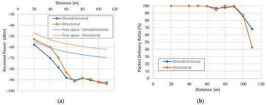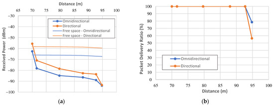 Figure 12 shows the average RSSI and PDR. Regarding the RSSI, the directional antenna received, on average, 7.2 dB more power than the omnidirectional one for distances up to 60 m. Above this distance, the RSSI was almost the same for both antennas. The attenuation increased with distance because of the vegetation density. Compared to location 1, Wi-Fi caused less interference, so the lowest measured RSSI value was −95 dBm. Figure 12b shows the packet delivery ratio. The systems did not lose packets for distances up to 60 m. Above this distance, the packet loss was similar for both antennas. However, the directional antenna had 7.5 dBi more gain than the omnidirectional one.