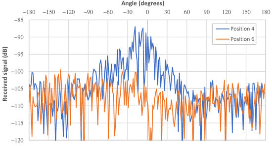 We also applied the deconvolution technique to estimate the received signal as a function of the azimuth angle. Figure 10 shows the results for two receiver positions. For position 4, the highest received signal came from a specific direction. This direction coincided with that used for the directional antenna to obtain maximum power. The signals received at position 6 were more dispersed in space, making the omnidirectional antenna more effective in capturing the transmitted power.