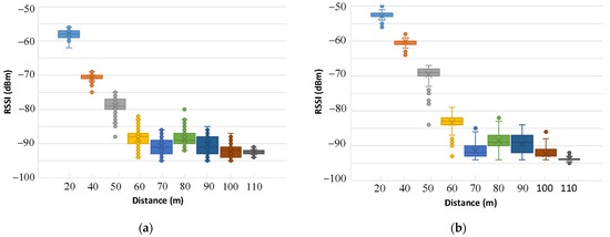 The third location for measurements was an area with vegetation. The Wi-Fi network broadcast from the university building also affected the ZigBee channel. Unlike the other environments, the signal attenuation was mainly due to obstruction in the entire propagation path. With the transmitter in a fixed position, we measured the RSSI and the PDR for the nine positions shown in Figure 3. The transmitter and receiver directional antennas were oriented to provide the highest RSSI and PDR values. We used the line formed by the transmitter and receiver antennas for the angle count. and are the angles of the transmitter and receiver antennas, respectively. For distances up to 70 m, both antennas were oriented in the same direction, meaning that . For the other distances, we obtained and , and , and , and , for 80 m, 90 m, 100 m, and 110 m, respectively. The non-zero angles corresponded to rotating the antennas toward the university building. Figure 11 shows boxplots of the dispersion of the measured RSSI. The fading due to vegetation may introduce RSSI variations of 10 dB or 15 dB in a few cm.