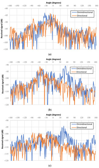 To understand the degradation in the directional antenna performance compared to the omnidirectional one, we measured the received signal as a function of the azimuth angle. Figure 13a shows the results for the distance of 50 m. In this case, the higher components arrived at the receiver from the transmitter’s direction, and the directional antenna provided a higher RSSI than the omnidirectional antenna. Figure 13b shows the results for the distance of 80 m. In this situation, the directional antenna did not improve the transmission performance compared to the omnidirectional one. For distances between 60 m and 100 m, the signal received by the system using omnidirectional antennas provided higher signal components for various azimuth angles, as seen in Figure 13b. The results for the directional antenna shown in Figure 13 also confirmed that the receiving antenna should be oriented around −50° to provide the highest received power. This orientation was the same as that for XBee to produce the best results. We noted that this coincided with the direction of the university building, which was the source of the Wi-Fi interference. Figure 13c shows the results for the distance of 100 m. Observing Figure 12b, the receiver lost many packets above this distance. The signals represented in Figure 13c show that they were more dispersed in space. Once again, the system with the omnidirectional antennas provided higher received signal components for various angles.