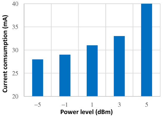 The system with the omnidirectional antenna used a higher transmit power. Higher transmit power means more power consumption. That is why many authors have proposed directional antennas, as they can reduce the power consumption of battery-operated networks. However, the control of directional antennas also consumes energy. Therefore, a comparison of power consumption between systems is required. Considering the transmit power, we measured the current consumption of the XBee S2C by inserting a shunt resistor of 1 Ω between the battery and the supply pin of the sensor node. The XBee S2C module uses the Silicon Labs EM357 chipset [34]. An oscilloscope connected to the resistor terminals allowed us to obtain the current results. Figure 14 shows the measured transmit current for each power level. There is a difference of 12 mA between the highest and the lowest power levels with the boost mode disabled. Activating the boost increased the current consumption, on average, by 5.5 mA.