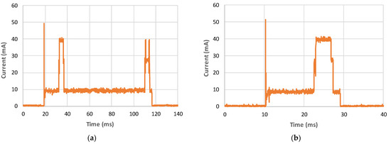 We measured the current consumption with the XBee operating as an end device and transmitting 111-byte packets. Figure 15 shows the current consumption for the highest power level and two operating conditions. The graphs are similar to those represented in [40] for the radio CC2530. Figure 15a refers to the case in which the system uses application acknowledgements (ACK). In this case, the active period lasted 98.5 ms. The duration of the transmit mode and the idle/receive modes were 3.6 ms and 5.7 ms, respectively. For a processing current of 9 mA, the system consumed, on average, 11.6 mA during the active period. The current consumption would be 11 mA for the lowest transmit power level. The difference between both cases was 0.6 mA (1 mA with boost mode enabled). Figure 15b describes the current consumption for transmissions without application acknowledgements. The active period lasted 18.6 ms. The difference in current consumption between the highest and lowest transmit levels was, on average, 2.3 mA (3.5 mA with boost mode enabled). When the sensor node operates as a router, the power consumption is practically independent of the transmit power.