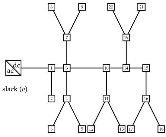 This test feeder corresponds to an adaptation of the original monopolar DC distribution grid proposed in [24] to evaluate the convergence of the Newton–Raphson method in power flow studies involving DC networks. The grid topology of this test feeder is depicted in Figure 1.