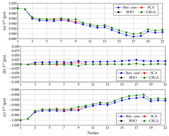On the other hand, Figure 3 presents the behavior of the voltage profiles in all the nodes of the 21-bus system for each pole, considering the benchmark case as well as the solution reached with each one of the metaheuristic optimizers.