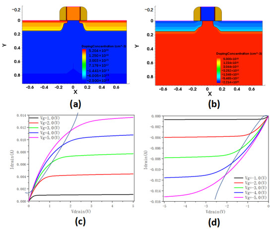 The simulation result of NMOS and PMOS structure models are shown in Figure 5. Figure 5a,b are the physical structure model simulation diagrams of NMOS and PMOS devices, respectively. The length of the model simulation diagram is 1.48 μm and the height is 1.2 μm. Figure 5c is a simulation graph of transmission characteristics of NMOS devices. When the gate voltages are fixed at 1.0 V, 2.0 V, 3.0 V, 4.0 V and 5.0 V, respectively, the relationship curves between drain current and drain voltage are obtained. It can be found that when the gate voltage is greater than the turn-on voltage, the drain current curve shows a linear curve when the drain voltage is low, and the NMOS is equivalent to a variable resistor. At high level, the drain current does not change with the gate voltage, but mainly depends on the drain voltage. Figure 5d is a simulation graph of transmission characteristics of PMOS devices. When the gate voltages are fixed at −1.0 V, −2.0 V, −3.0 V, −4.0 V and −5.0 V, the relationship curves between drain current and drain voltage are obtained. Contrary to NMOS, the drain current curves show a linear curve when the drain voltage is at a high level, while the drain current is mainly determined by the drain voltage at a low level. By analyzing the simulation results of the NMOS and PMOS structure models, it can be concluded that NMOS and PMOS devices accord with their electrical characteristics.