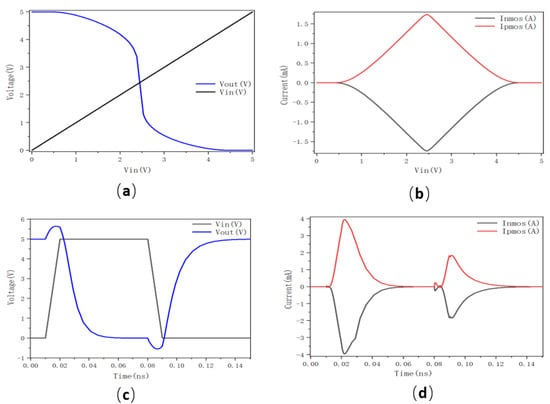 Transmission characteristic curve and transient characteristic curve of the CMOS inverter. (a) voltage transmission characteristic curve; (b) Current transmission characteristic curve; (c) voltage transient characteristic curve; (d) Current transient characteristic curve.