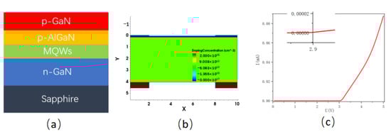 (a) Micro-LED epitaxial structure diagram. (b) Simulation result diagram of micro-LED equipment. (c) Simulation result diagram of the volt-ampere characteristic curve of a Micro-LED.