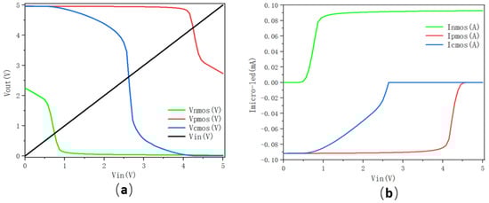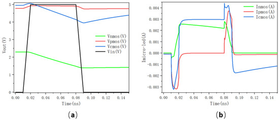 The simulation results of PMOS, NMOS and CMOS inverters driving Micro-LEDs directly are shown in Figure 11. Figure 11a,b show the output characteristic curve. The green curve is the change curve of Micro-LEDs driven by NMOS. It can be seen that when the input level is low, the output voltage is less than 5 V, (about 2.2 V), and the current value through the micro-LED is close to 0 A (1.9275 pA). This is because the NMOS is not completely turned off at a low level, and current flows through it, and the equivalent resistance of NMOS is similar to that of the micro-LED at this time, which leads to the voltage division between the NMOS and the Micro-LED. When the input voltage is high, the NMOS is on, and the micro-LED has a large partial voltage, which makes the output voltage close to 0 V and the current through the micro-LED close to 90 mA. Therefore, the driving circuit forms the switching characteristics of low-level off and high-level on, but an NMOS driving micro-LED has the disadvantage of an incomplete low-level off. The red curve is the change curve of the PMOS driven Micro-LED. When the input level is low, PMOS is on, its output voltage is close to 5 V, and the current through the micro-LED is close to −90 mA. When the input voltage is high, its output voltage is less than 0 V (about 2.8 V), and the current value through the micro-LED is close to 0 A (−0.9679 pA). This is because the PMOS is not completely turned off at the high level, current flows through it, and the equivalent resistance of the NMOS is close to that of the Micro-LED, so the voltage division between the NMOS and the micro-LED is close. Therefore, the driving circuit has the switching characteristics of low-level on and high-level off, but the PMOS driving the micro-LED has the disadvantage of an incomplete high-level off. The blue curve is the change curve of the CMOS inverter driving the Micro-LED. Unlike the first two, in the circuit of the CMOS inverter driving the Micro-LED, the micro-LED device is located between the output terminal of the CMOS inverter and the ground level. Therefore, the micro-LED will not start until the output voltage reaches the micro-LED turn-on voltage. As can be seen from Figure 11a, when the input voltage is about 2.644 V, the output voltage is 2.9 V, which reaches the turn-on voltage of the Micro-LED. Therefore, when the input voltage is low, the driving circuit is on, and the current value through the micro-LED is close to −90 mA; when the input voltage is high, the driving circuit is off, and the current value through the micro-LED is close to 0 A. Therefore, the driving circuit forms the switching characteristics of low-level on and high-level off, and the CMOS inverter driving the micro-LED does not have the problem of incomplete off.