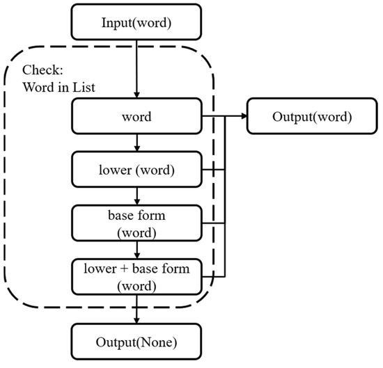 In this section, the extraction of topic-based features from texts for determining whether the texts contained in the images are spam-related is discussed. First, LDA, which is a stochastic topic model based on the Dirichlet distribution, is used to extract topic words from text. The flowchart in Figure 2 outlines the details of the word-filtering process. Word-filtering is performed on words extracted from the LDA model. The word-filtering process checks whether the extracted words exist in the word list of the pretrained word2vec sub-model that contains many commonly used words. Therefore, words that do not exist in the word2vec sub-model are recognized as errors by the OCR model. In contrast, words that are not misrecognized, but do not exist in the word list, are either checked by converting them into lowercase during the word filtering process or into verbs in their base forms to obtain similar topic-based features. If the modified word is included in the word list, the word filtering process returns the changed word. Finally, word-embedding techniques convert the filtered words into vectors corresponding to each word. Each vector is an embedding vector containing the characteristics of words. The embedding vector is obtained from a pre-trained model that learns various relationships between words from many documents. The vectors can perform various calculations instead of words, and the calculated vectors can be converted back into the most similar words. For example, vector (“Seoul”) − vector (“Korea”) + vector (“Japan”) = vector (“Tokyo”) illustrates a possible calculation. Spammers use images that contain words related to spam to distribute spam content. We used the embedding vector to extract the features of frequently appearing words in spam images.