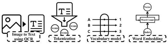 Two preprocessing steps were performed to extract text- and convolution-based features from one image. First, the size and channel of the image were changed for use as input to the sub-model to enable the extraction of convolution-based features. A convolution-based sub-model receives only fixed-size data. Therefore, the images of the three channels representing red, green, and blue (RGB) colors were changed to a width and height of 256 pixels each. Next, the characters contained in the image were transformed into text for use as input into the sub-models to perform text feature extraction. The Tesseract OCR [49] tool was used to extract text from images. The extracted text was then tokenized using the Natural Language ToolKit (NLTK) library. In this process, special characters (e.g., @, #, !, ~, etc.) contained in the words were removed.