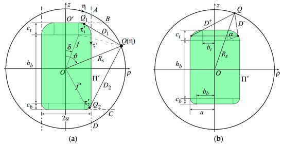 When adopting such a model, the length of the curve is , wherein and , and the parameters and , which are involved in relations (3) and (4) to evaluate η and ψ, can be determined by properly taking into account the position of the tangency points on . Five cases occur for ranging in [0, π] (see Figure 2a). Accordingly, when belongs to the range , where , it follows: