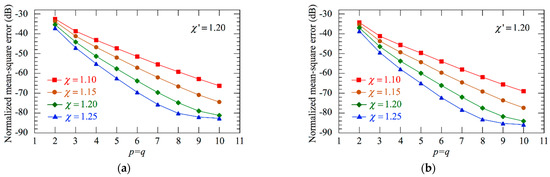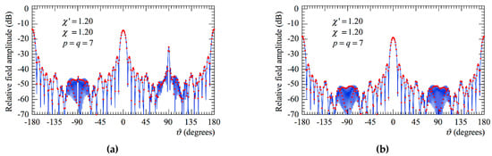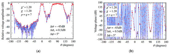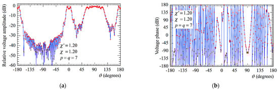 To test the precision of OSI Formulas (24) and (27) from a qualitative standpoint, the reconstructions of the amplitudes and phases of the probe and rotated probe voltages, and , on the meridians at ∏ = 0° and ∏ = 90° are compared in Figure 3 and Figure 4 with the corresponding exact ones. As can be seen, the reconstructed pattern agrees very well with the exact one. To further confirm the precision of these formulas from a more quantitative standpoint, the mean-square reconstruction errors have been evaluated by comparing the exact values of and at the points of a dense lattice on the scanning sphere with the recovered ones and normalizing them to the maximum voltage value over the sphere. These errors, evaluated for and some and p = q values, are reported in Figure 5 and show a decreasing behavior as , p, and q increase. This allows a proper choice of the OSI parameters for a given value of tolerable reconstruction error. Note that the OSI parameters adopted here have been properly chosen in order to guarantee a mean-square reconstruction error of at least −70 dB, which can be considered negligible with respect to the measurement error (about −40 dB). The algorithm robustness with respect to errors affecting the NF data has been also verified. To this end, the exact NF samples have been corrupted with severe random errors, which simulate a background, bounded to (dB) in amplitude and with arbitrary phase, and an uncertainty on each sample of (dB) in amplitude and (degrees) in phase. As shown in Figure 6, the algorithm results are also stable, since it does not amplify the errors injected on the exact samples.