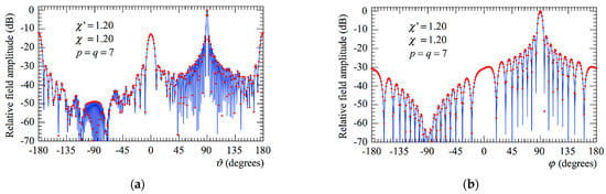 Far-field pattern in the cut plane at φ = 60°. Blue solid line: exact. Red dots: interpolated from the non-redundant samples: (a) FF ϑ-component; (b) FF φ-component.