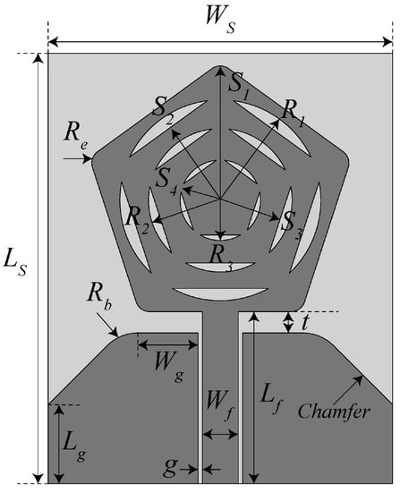 where A denotes the radius of the of the pentagonal radiator, which is equal to 9.6 mm. The parameters and k in Equation (1) correspond to the lowest operating frequency of the antenna and the effective relative permittivity () of the dielectric substrate, respectively.