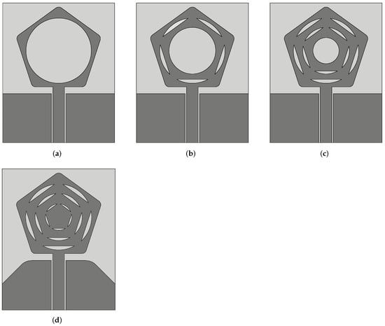 The design steps of the proposed CPW-fed pentagonal fractal antenna are shown in Figure 3a–d. In the first step, a CPW-fed circle-inscribed pentagonal radiator is designed, as shown in Figure 3a. The pentagonal radiator’s dimensions are calculated using the following expression [22].