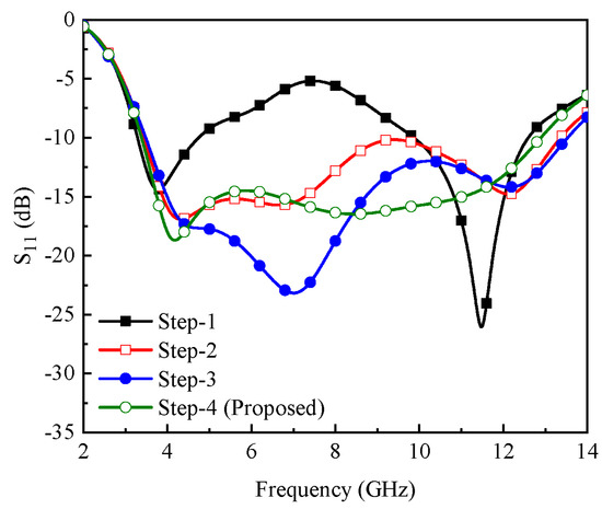The antenna design shown in Figure 3a is simulated in the CST Microwave Studio and the respective reflection coefficient (S) is given in Figure 4. From the figure, it is observed that the design shown in Figure 3a provides a dual-band response at 4 GHz and around 12 GHz. In the second step, another circle-inscribed pentagonal patch is added in the Step-1 design, as shown in Figure 3b. This modification tends to excite higher order modes and ultimately leads to a UWB response in the band of interest (see Figure 4, Step-2). For improved matching, another pentagonal radiator is added in the Step-2 design, as depicted in Figure 3c. This design offers improved impedance matching in the band of interest, as shown in Figure 4. To further optimize the response, another pentagonal patch is designed with the Step-3 design, as shown in Figure 3d. In this step, the ground plane shape is changed to a trapezoidal shape (see Figure 3d). This modification led to a UWB response in the frequency range of 3.38–12.89 GHz, as shown in Figure 4.