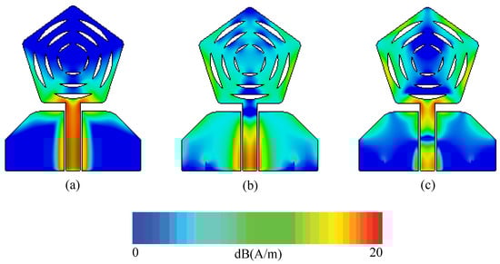 Simulated surface current distribution of the proposed CPW-fed pentagonal fractal antenna at (a) 4 GHz, (b) 8 GHz, and (c) 12 GHz.