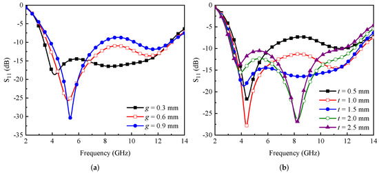 Effect of parameter (a) g and (b) t on the antenna’s performance.