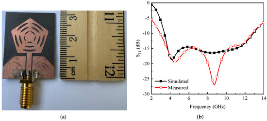 To verify the simulation results, the designed antenna was fabricated using the miling process. The prototype of the fabricated antenna is shown in Figure 7a. The S of the proposed antenna was measured by Rohde Schwarz (R&S) using the vector network analyzer (VNA) ZVA-67. The simulated and measured S characteristics are shown in Figure 7b. The antenna has a computed impedance bandwidth of 9.51 GHz in the frequency range of 3.38–12.89 GHz and a measured impedance bandwidth of 9.7 GHz in the frequency range of 3–12.7 GHz (see Figure 7b). Some discrepancies are observed between the simulated and measured results, which could arise due to fabrication tolerances, SMA connector losses, and the scattering measurement environment.