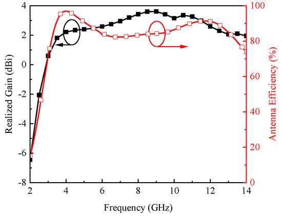 Figure 9 shows the realized gain and efficiency of the proposed antenna. The peak gain of the antenna is noted to be 3.6 dBi at 8.5 GHz, while the minimum gain is 0.6 dBi at 3 GHz, as shown in Figure 9. Furthermore, the efficiency of the antenna is noted to be >80% for the entire operating bandwidth (see Figure 9).