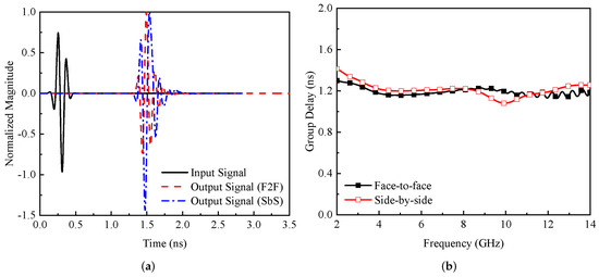 The group delay for both the configurations, shown in Figure 10, is presented in Figure 11b. The group delay is defined as the negative rate of change of the transfer function phase, with respect to frequency. The group delay quantifies the transition time taken by the signal to travel through a device [23]. Mathematically, it can be calculated as: