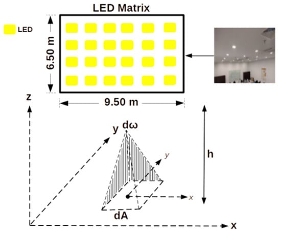 Illustration of the study area, where there are 24 LED ceiling lamps; each LED has a maximum luminance of 6600 lux.