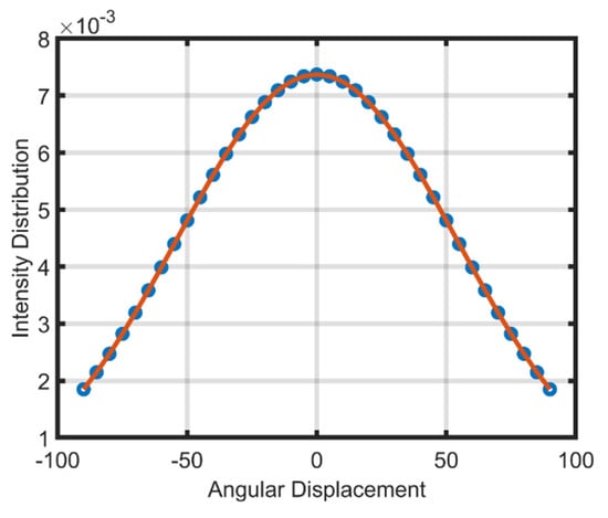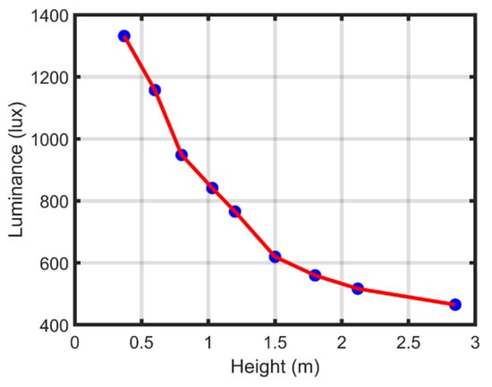 The main concern about artificial light is the amount of light intensity with respect to the surface of the observer. The intensity of the LED follows the Lampartian principle [19,20], where the degree of illuminance varies according to , which represents the change in the cosine angle with respect to the observer surface dA. The light intensity of a white LED can be represented using the Gaussian distribution function as in (1) [20,21,22]. The light intensity varied according to the angular displacement as in Figure 6, where is bounded by a minimum of −90 degrees and a maximum of 90 degrees. The maximum intensity can be obtained at the mean value of the Gaussian distribution. The illuminance intensity of any light source describes the amount of luminous flux at angle as shown in Figure 5, where the illuminance intensity can be calculated as in (2) [19]. Therefore, the illuminance intensity of the LED decreases as the height h from the light source increases, as measured in Figure 7.