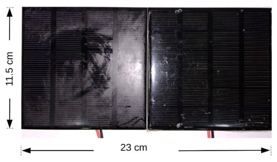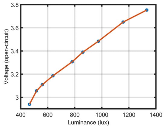 Polycrystalline (P-c) and monocrystalline (M-c) solar cells are the most commonly used types of silicon PV [27]. P-c solar cells are synthesized from several silicon crystals. The efficiency of the P-c solar cells can reach 13%. On the contrary, M-c solar cells are synthesized from a single silicon crystal. The M-c silicon cells have higher efficiency than the P-c cells, which can reach 15% [28]. However, the prices of M-c cells are much higher than P-c cells. Besides the silicon-based solar cells, the PV effect can be obtained from different non-silicon materials such as organic solar cells, perovskite solar cells, and dye-sensitized solar cells [29,30,31]. In this study, two P-c solar panels have been used to collect the ambient light from the indoor environment. The solar panels have a total area of square centimeters, as shown in Figure 9. The light intensity in the study area varies according to the height of the light source. The closer the distance to the light source, the higher the luminance intensity; hence, the generated voltage is proportional to the luminance intensity, where the measured relation is shown in Figure 10. The relation between the height and the open-circuit generated voltage can be found in Figure A2.