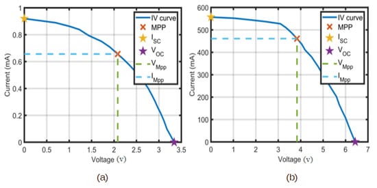 The panels have been connected in a parallel configuration to maximize the output current since a single panel has an outdoor maximum output current of 390 mA and 0.644 mA for indoor performance. The measured outdoor and indoor performance of the panels is shown in Figure 11. The figure describes the non-linear relation between current and voltage, known as the IV curve. The Maximum Power Point (MPP) is the result of the direct multiplication of the maximum current times the maximum voltage , as in (5). The outdoor MPP value was 1.76 W, and in contrast, the indoor MPP was 1.4 mW. The modeling of PV cells is significant in studying the efficiency of solar panels. There are two common models for solar cells: the one-diode model and the two-diode model [32]. Both models can represent the solar cell, whereas, in this study, we used the one-diode representation as in Figure 12.