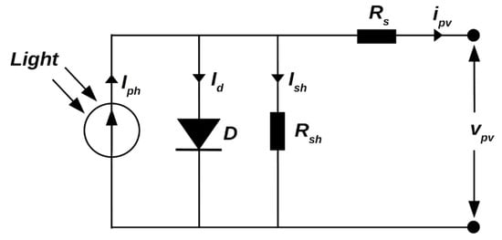 The one-diode model describes the parameters of the solar cells where represents the source photon current generated by the PV effect. The total net current can be calculated as in (6) where is the reverse saturation current, is the shunt current, T is the absolute temperature, q is the charge of the electron, k is the Boltzmann constant, is the shunt resistor, is the voltage difference across the PV cell terminals, is a series resistor, and is the diode factor [33,34]. The efficiency of the solar cell is related to the ratio between the input power and the maximum output power. The maximum outdoor solar irradiance is (1000 w/m2), where the total size of the solar panel is (). The outdoor efficiency of the P-c solar panels can be estimated as in (8), where FF is the fill factor as in (7).