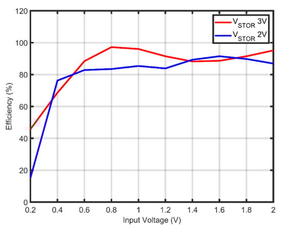 The PMU is essential for IoT applications that work without a consistent power supply [36,37,38]. In this study, the Texas Instrument bq25570 energy management module [39] was used to manage the harvested solar power. The module is mainly designed for ULP applications where it provides an efficient power extraction from low-power, high-input impedance generators such as solar cells. The module’s operation starts by converting the input voltage into higher voltage levels through an embedded DC to DC boost converter. The converter can operate at a low starting input voltage of 330 mV; once the voltage at the boost charger terminal reaches 1.8 V, the converter will accept lower voltages as 120 mV. The efficiency of the boost converter depends on the amount of power reaching the storage element concerning the input power as in (12). Figure 13 shows the efficiency curve of the boost charger concerning the input voltage. In addition to this, the module offers a programable MPPT unit that enables extracting the maximum power under various ambient light conditions. Additionally, the module can maintain a stable output voltage through the embedded buck converter, which can deliver up to 100 mA to the buck converter output terminal. Figure 14 shows the bq25570 module and the connection terminals.