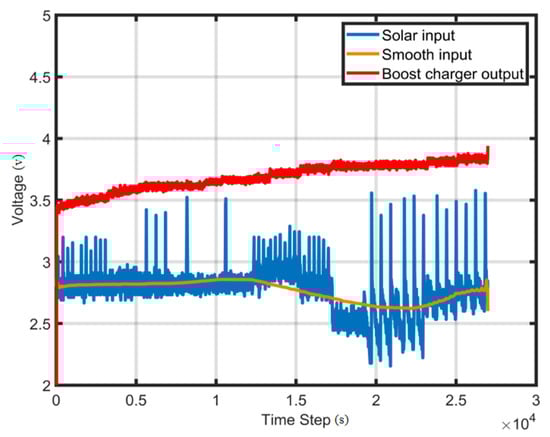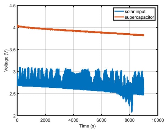 There are many types of rechargeable batteries that can be used to store the harvested voltage, such as lithium-ion (Li-ion) and Lithium-ion Polymer (LiPo) batteries. However, these types of storage elements have a high Equivalent Series Resistance (ESR) and a short cycle life [40,41]. The supercapacitor can be used alternative to batteries in energy harvesting applications [42,43,44]. The supercapacitors have low ESR, which provides a fast peak power delivery. Additionally, supercapacitors have a long cycle life compared with Li-ion batteries. In this study, we used a 90 F supercapacitor with a maximum charging voltage of 4.2 V to store the harvested solar power. Figure 15 shows the open-circuit supercapacitor charging curve through the PMU.