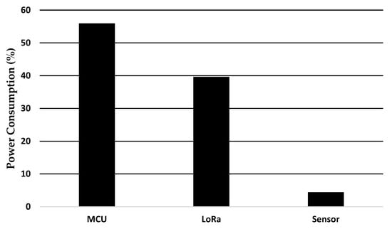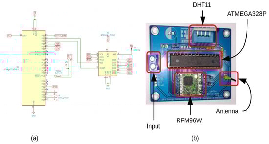 The wireless sensor unit consists of three main components, the DHT11 humidity and temperature sensor, the ATMEGA328P MCU, and the RFM96W LoRa module [45,46], as shown in Figure 16; more design details can be found in Figure A1. Table 2 describes the current and voltage characteristics of the WSTx components. The MCU can manage the control signals and the communication protocols; hence, the MCU is the key element in reducing the power consumption from the WStx. Many studies have been published about reducing MCU power consumption. For instance, Amit Sinha et al. [47] proposed an Operating System (OS) based dynamic power management of WSN. The authors proposed event-driven power management to reduce the power consumption where the OS can automatically determine the operation mode of the MCU. Additionally, the OS can adjust the MCU frequency to optimize the power consumption. The authors suggest an ARM-based MCU for the OS implementation. However, the implementation of OS in limited resource 8-bit microcontrollers such as the ATMEGA328P will force the MCU to operate at higher frequencies dissipating more energy. Another study by Ling Lin et al. [38] proposed a multipower space fabrication scheme for MCUs to reduce the power consumption during sleep mode, which required a redesign of the MCU.