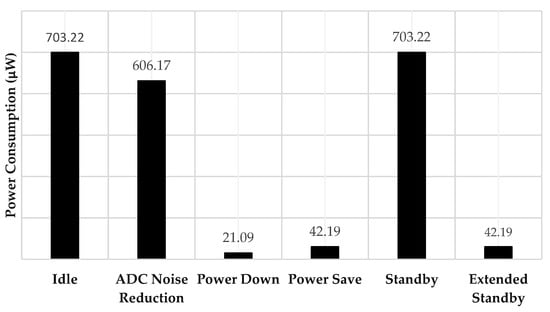 Figure 19 illustrates the power consumption of the ATMEGA328P sleep modes, where the power down represents the most miniature power consumption mode. The power-down sleep mode halts the system clock where an interrupt signal is required to wake up the processor. Since the WDT is separate from the system clock, it can be used as a system clock-independent device to wake up the processor. Therefore, we used the WDT to produce an internal interrupt signal after completing the sleep duration. The WDT has been set to the maximum time-out value of 8 s.