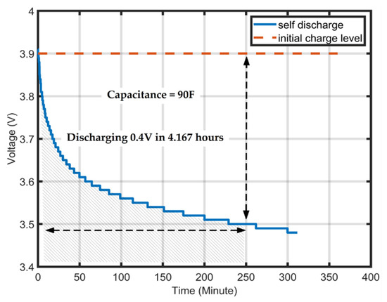 The maximum voltage limit of the supercapacitor represents one of the fundamental limitations in the harvesting system, where it will affect the Ps side [52]. Additionally, the supercapacitor has an internal resistance in which self-discharging occurs without the presence of a load. The self-discharging problem can represent a challenge if there is no input power for a long duration, where the voltage across the supercapacitor should always be greater than 1.8 V. Figure 20 shows the measured voltage drop across the supercapacitor terminal due to the self-discharging impact.