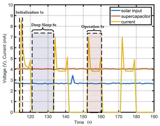The voltage drop can be minimized by increasing the deep sleep duration. However, the WDT of the ATMEGA328P has a maximum time-out duration of 8 s. Table 3 shows the results of the proposed firmware-based power reduction technique. In this measurement, the transmission power of the LoRa module was set to a fixed gain of 7 dbm; also, the power consumption was measured with a fixed input voltage of 3.7 V. The results prove the efficiency of disabling the ADC, reducing the internal clock frequency to 1 MHz, and selecting the power-down sleep mode. This technique reduced power consumption during the sleep mode to 21.09 µW and 11.1 mW in the operation mode. Figure 21 shows the current consumption during the initialization, operation, and sleep mode concerning the solar input the boost charger output.