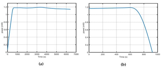 The sleep duration should be long enough to allow the solar harvester to compensate for the consumed power. Figure 23 shows the closed-circuit voltage drop across the supercapacitor terminals as an impact of the 8 s sleep duration. However, the WDT time-out of 8 s is not enough to support the WDTx for a long time where the capacitor charge can last only for continuous 6 h. The critical deep sleep time can be estimated based on the energy harvesting rate. Figure 24 compares the energy harvesting during the open- and closed-circuit configuration. The closed-circuit harvesting rate can reach a maximum of 1.2 mW per second; however, the energy harvesting rate declines rapidly due to the imbalance between power consumption and the power source. Therefore, at least 12 s of deep sleep are required to match the power consumption during the operation mode. The maximum power efficiency of the WSTx unit can be calculated as in (18). Fortunately, the current revolution in the Lithium-ion capacitor may significantly improve the supercapacitor’s electrical characteristics [54] by reducing the self-discharging rate.