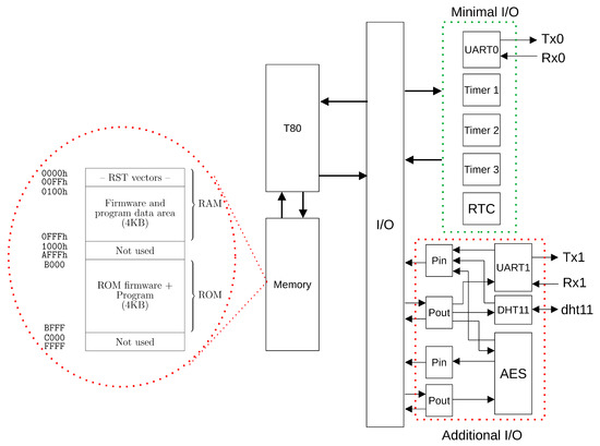 A Minimal implementation of the platform, with the 8-bit microprocessor, one UART and 16-KB memory, requires less of 2000 LUTs, which can be implemented on low-cost, small-size FPGAs.